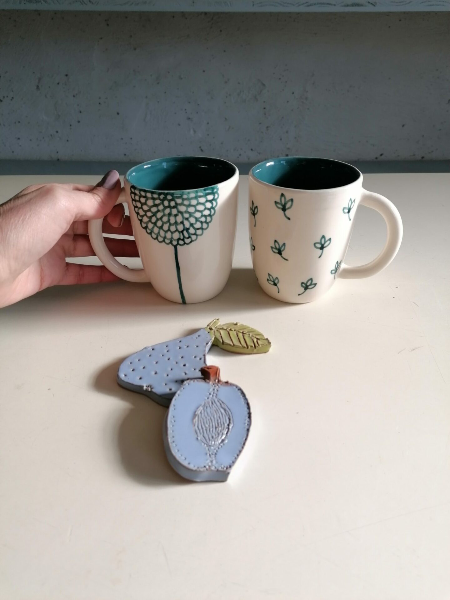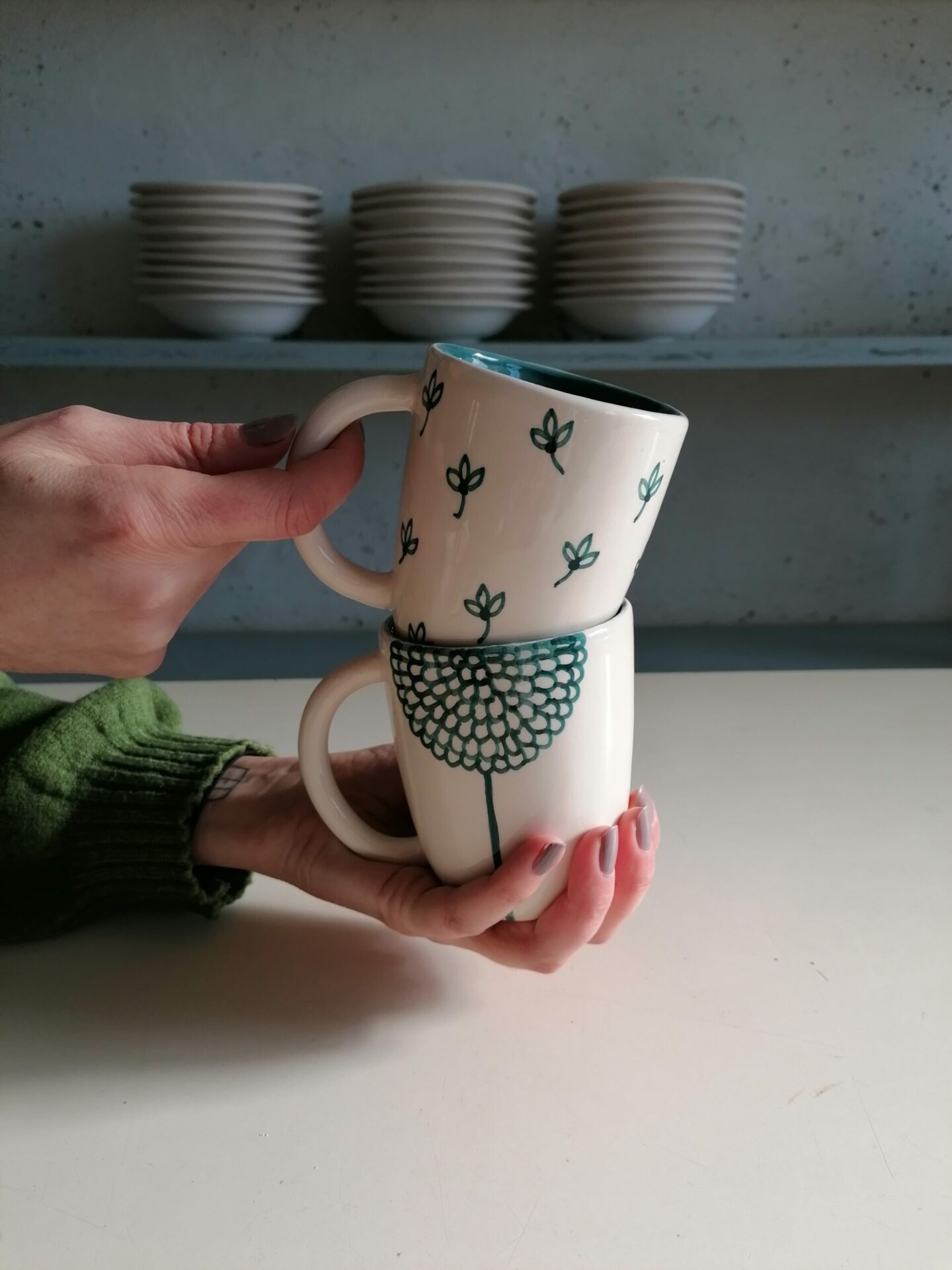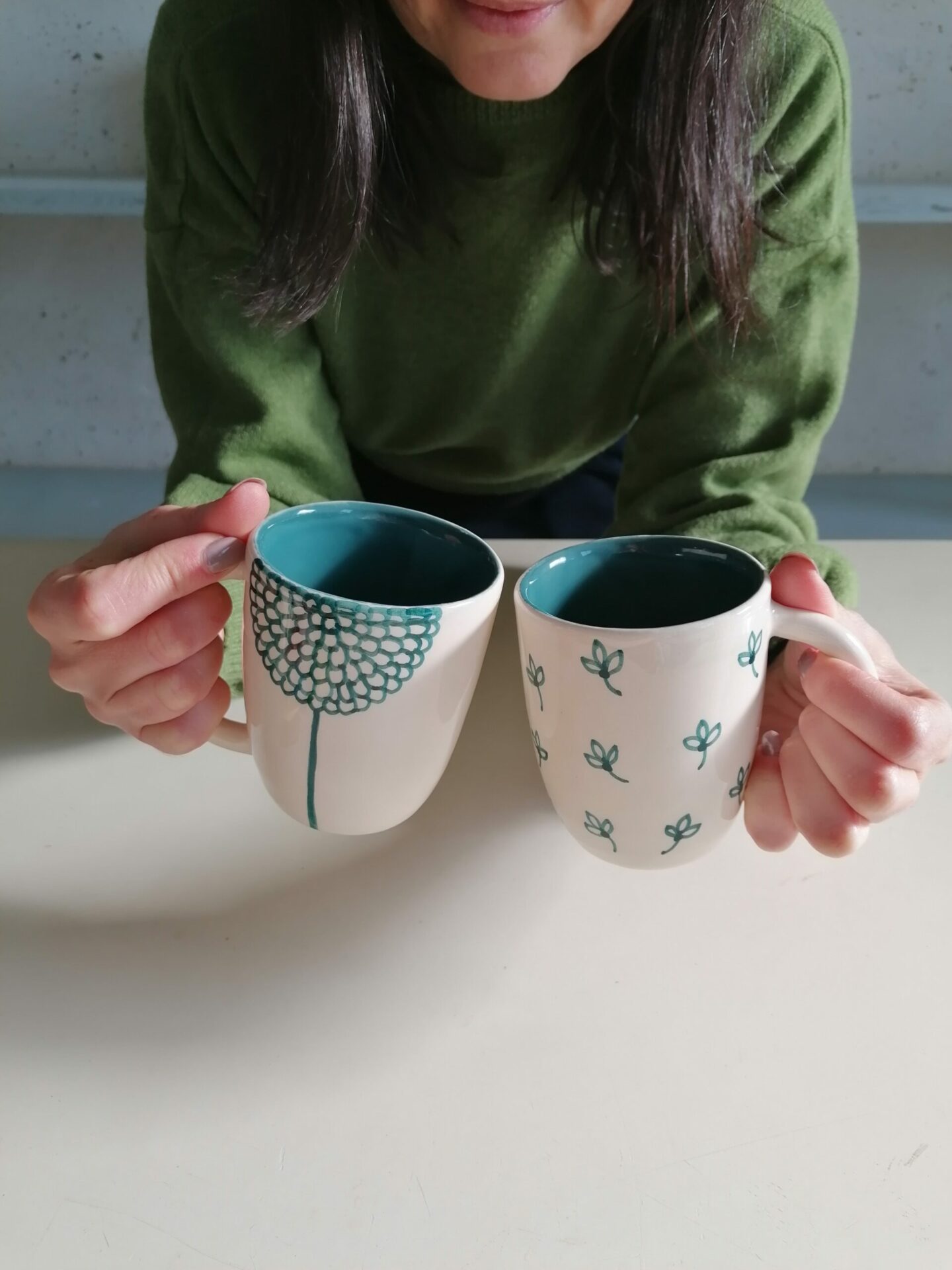 - Tazza in ceramica realizzata e decorata a mano, in argilla bianca