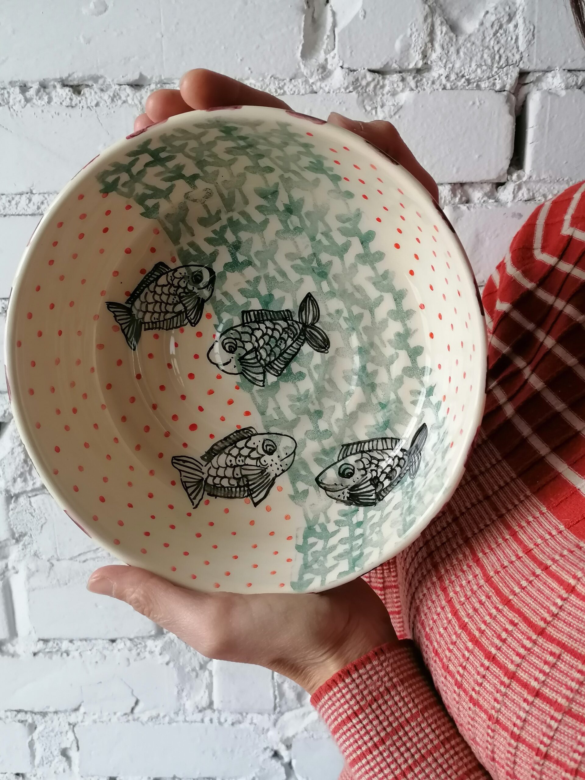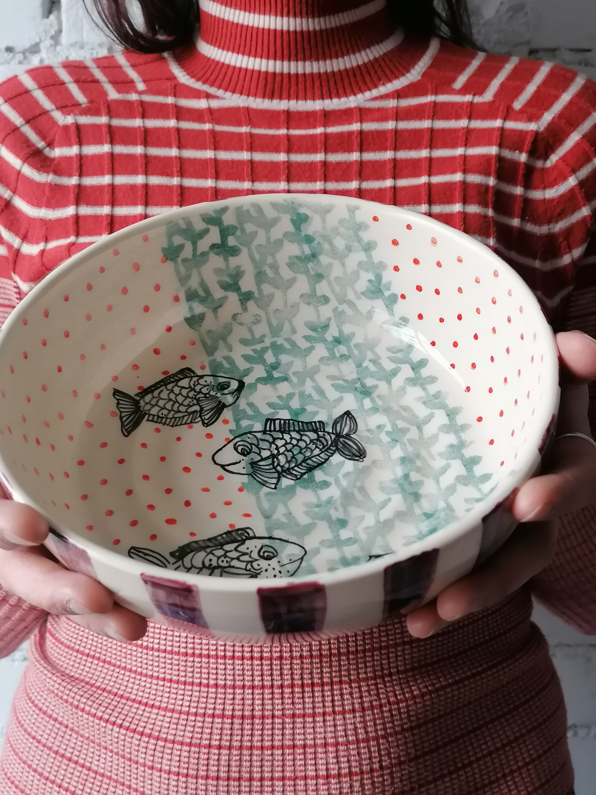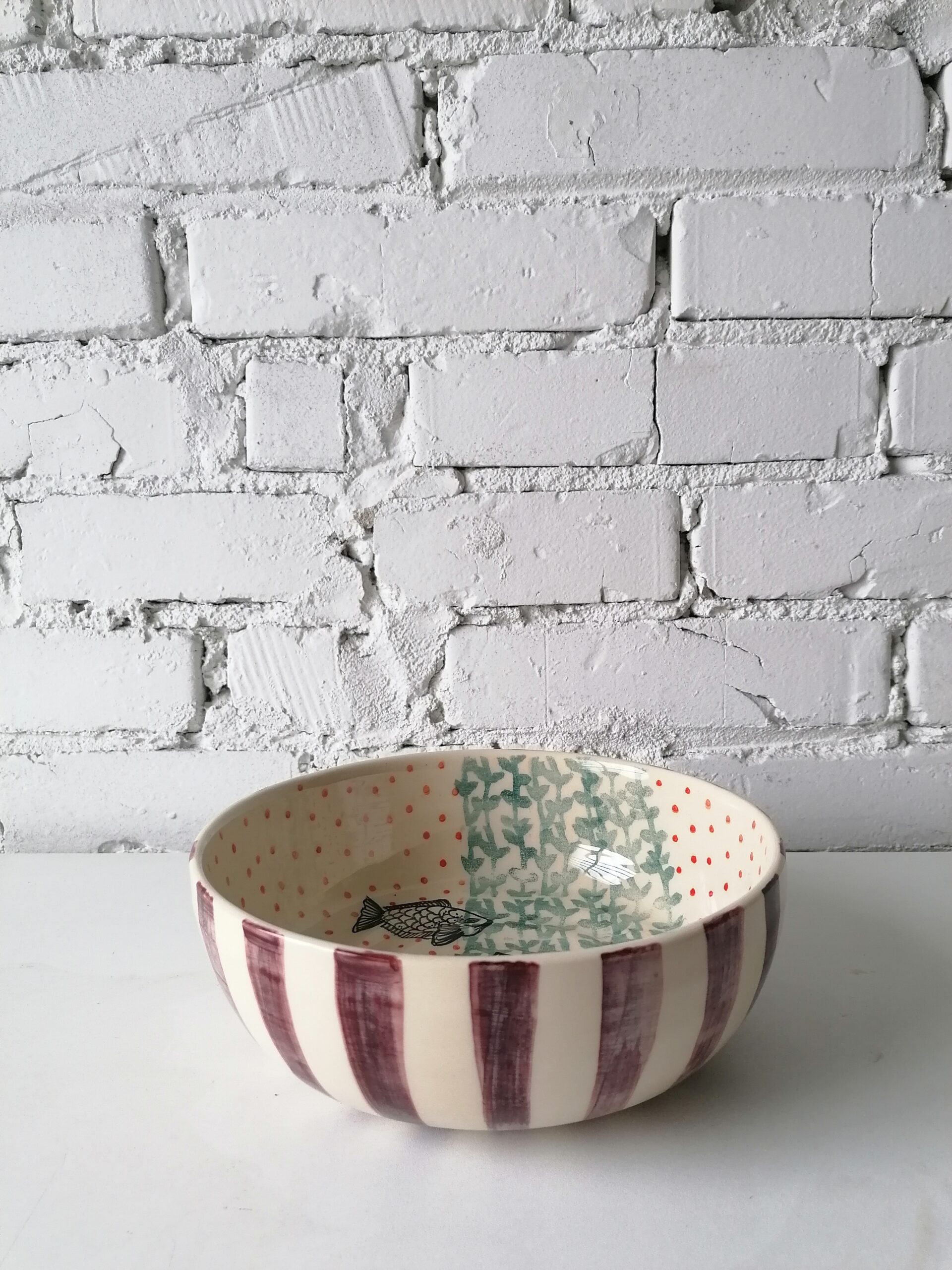 Fish decoration, textures and wide stripes in wine red and forest green tones