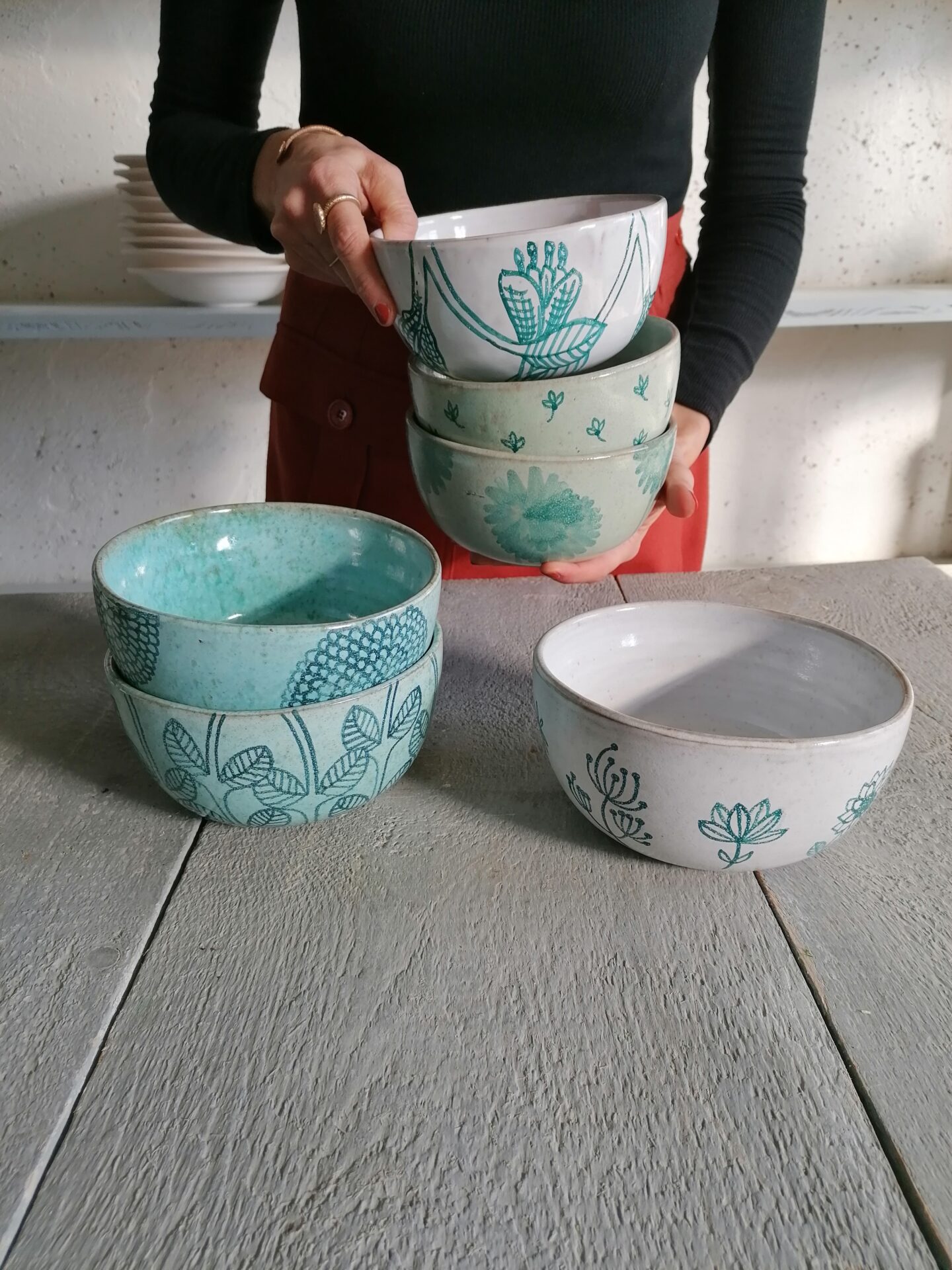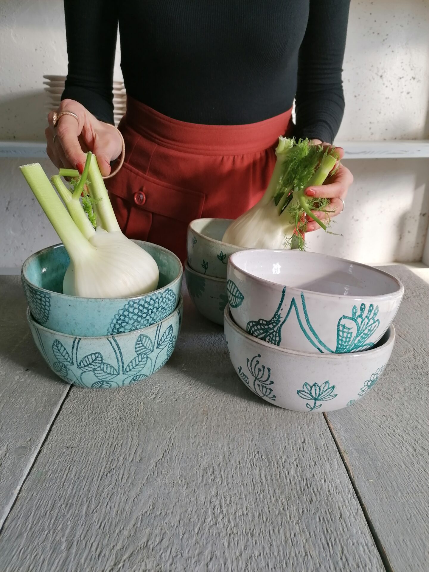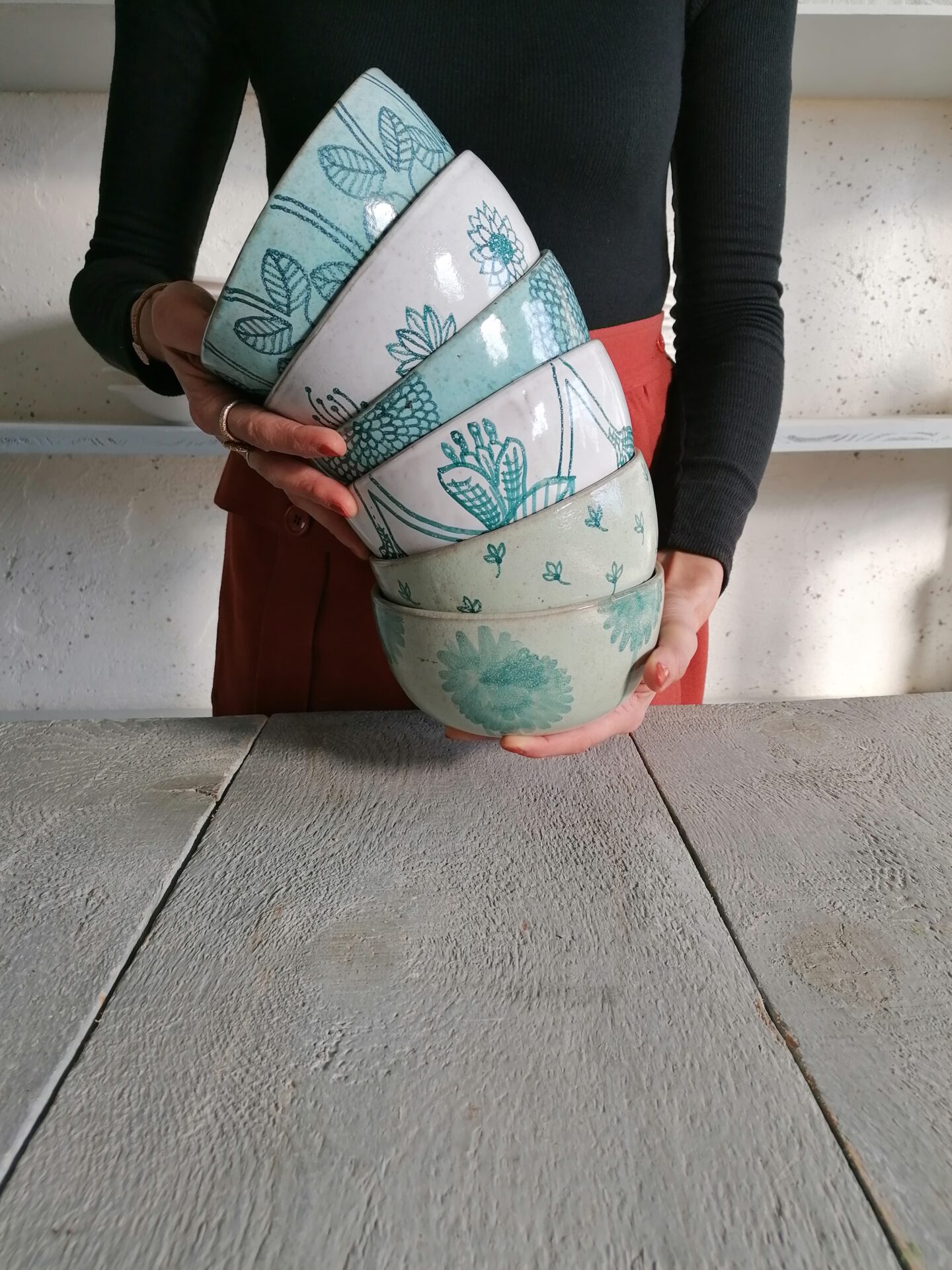 Nella collezione Fluida un colore liquido, appunto fluido, esalta la terracotta sottostante e fa muovere i decori rendendo, ogni volta, una sorpresa l’oggetto che esce dal forno.