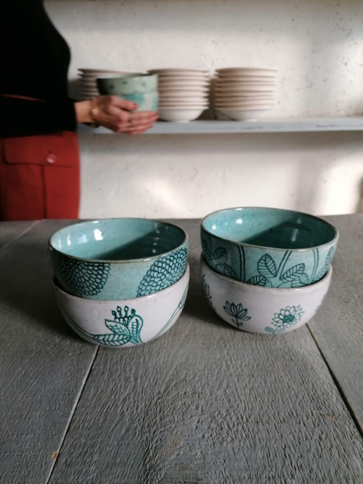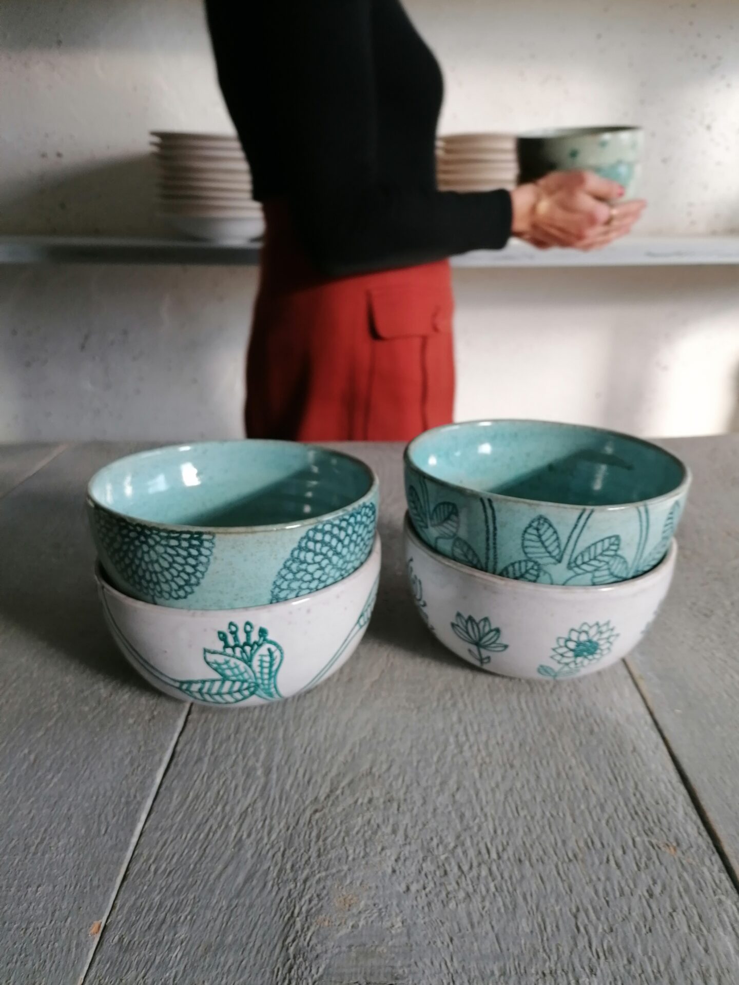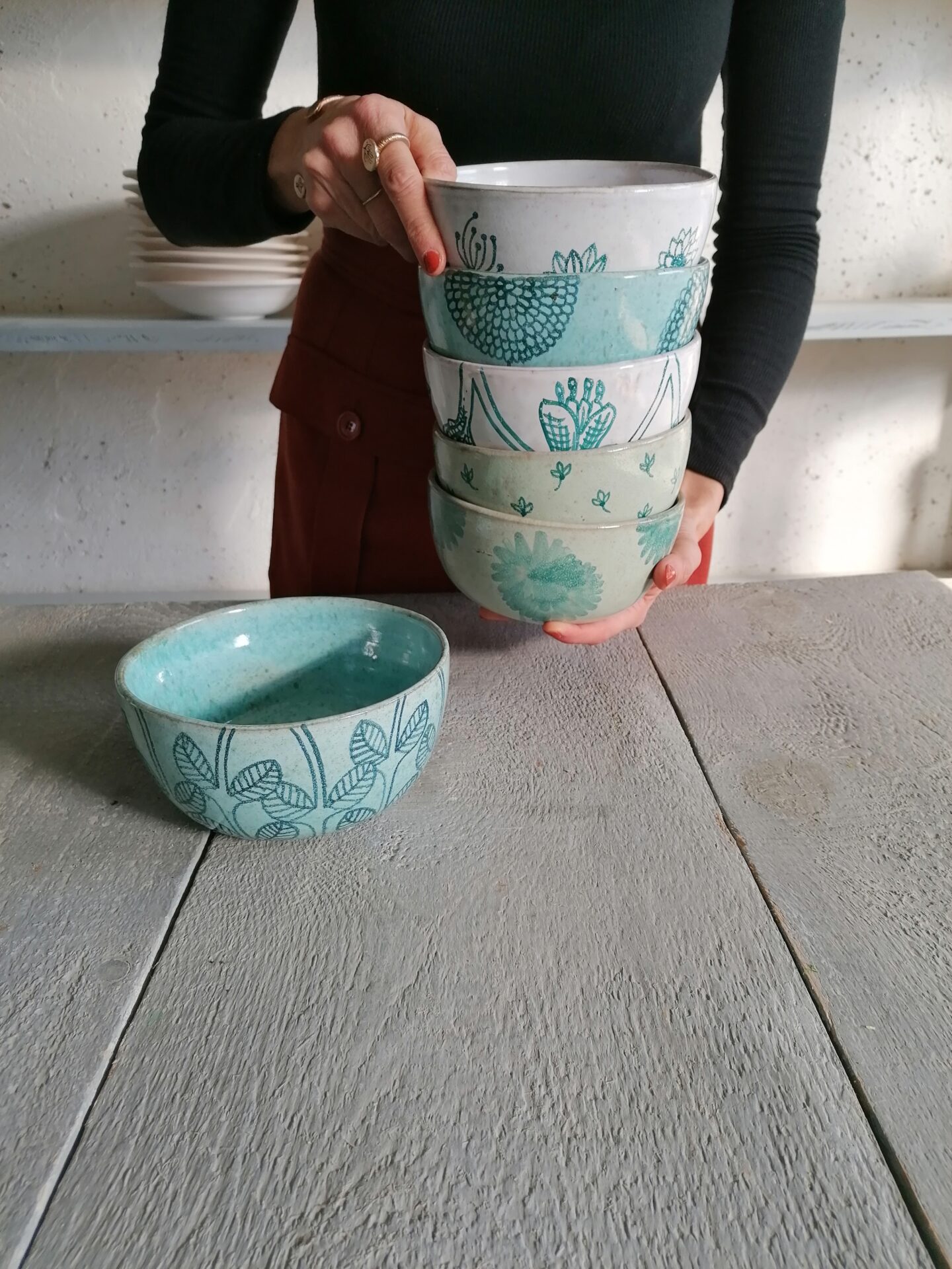 Nella collezione Fluida un colore liquido, appunto fluido, esalta la terracotta sottostante e fa muovere i decori rendendo, ogni volta, una sorpresa l’oggetto che esce dal forno.