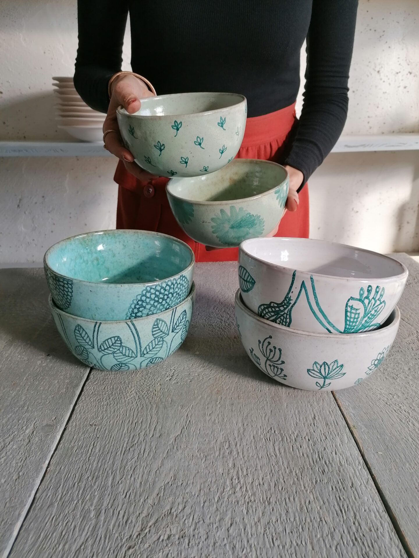 GREEN AQUAMARINE WHITE BOWL h8cm set of 6