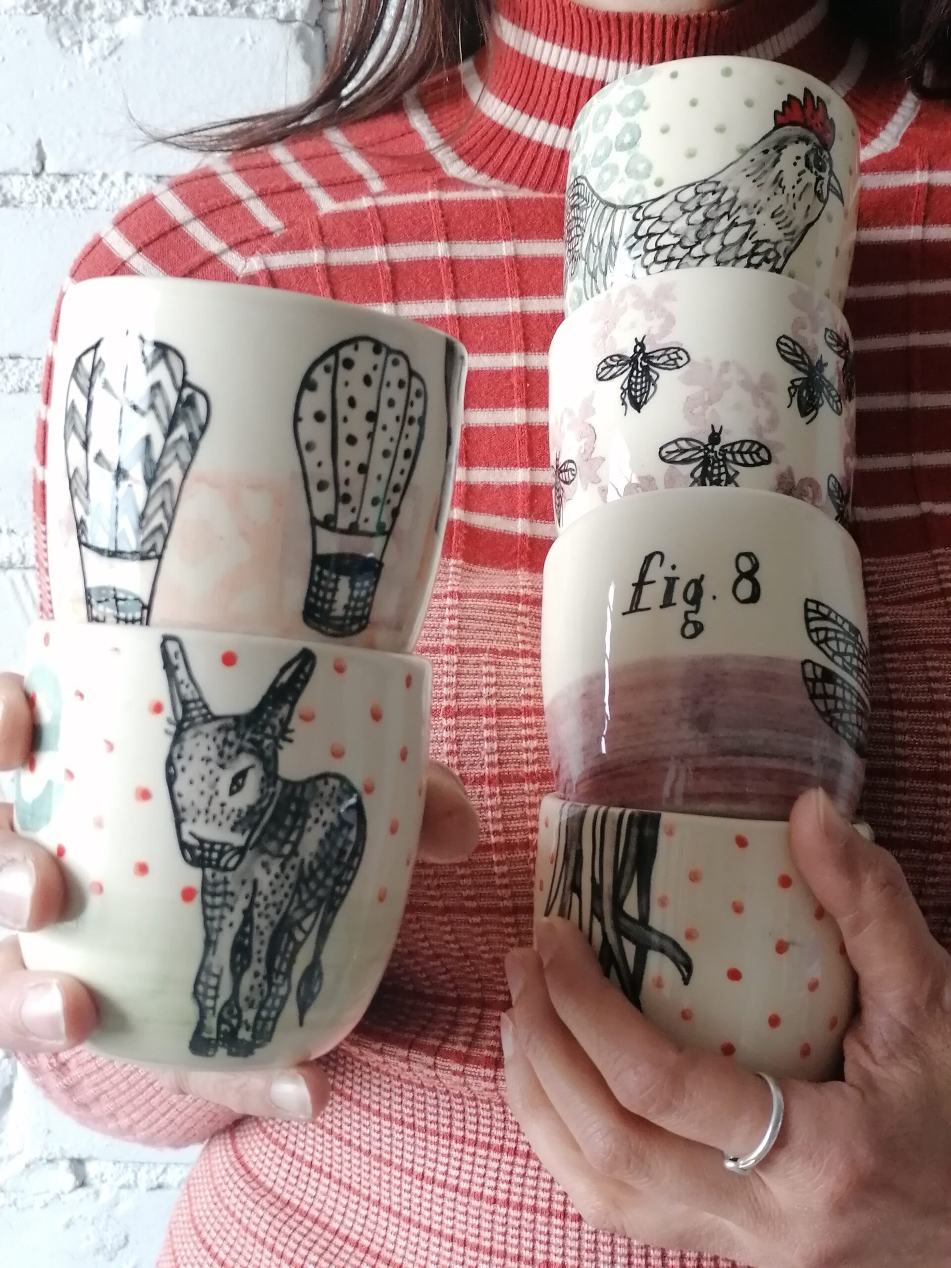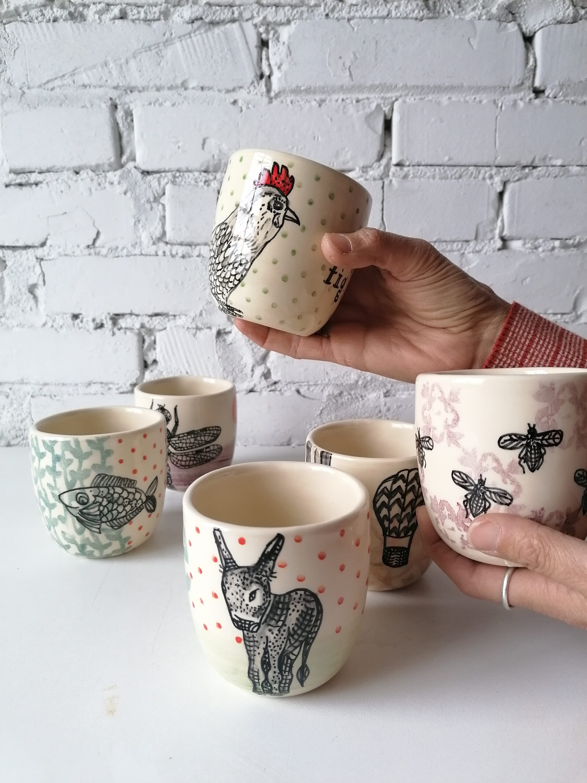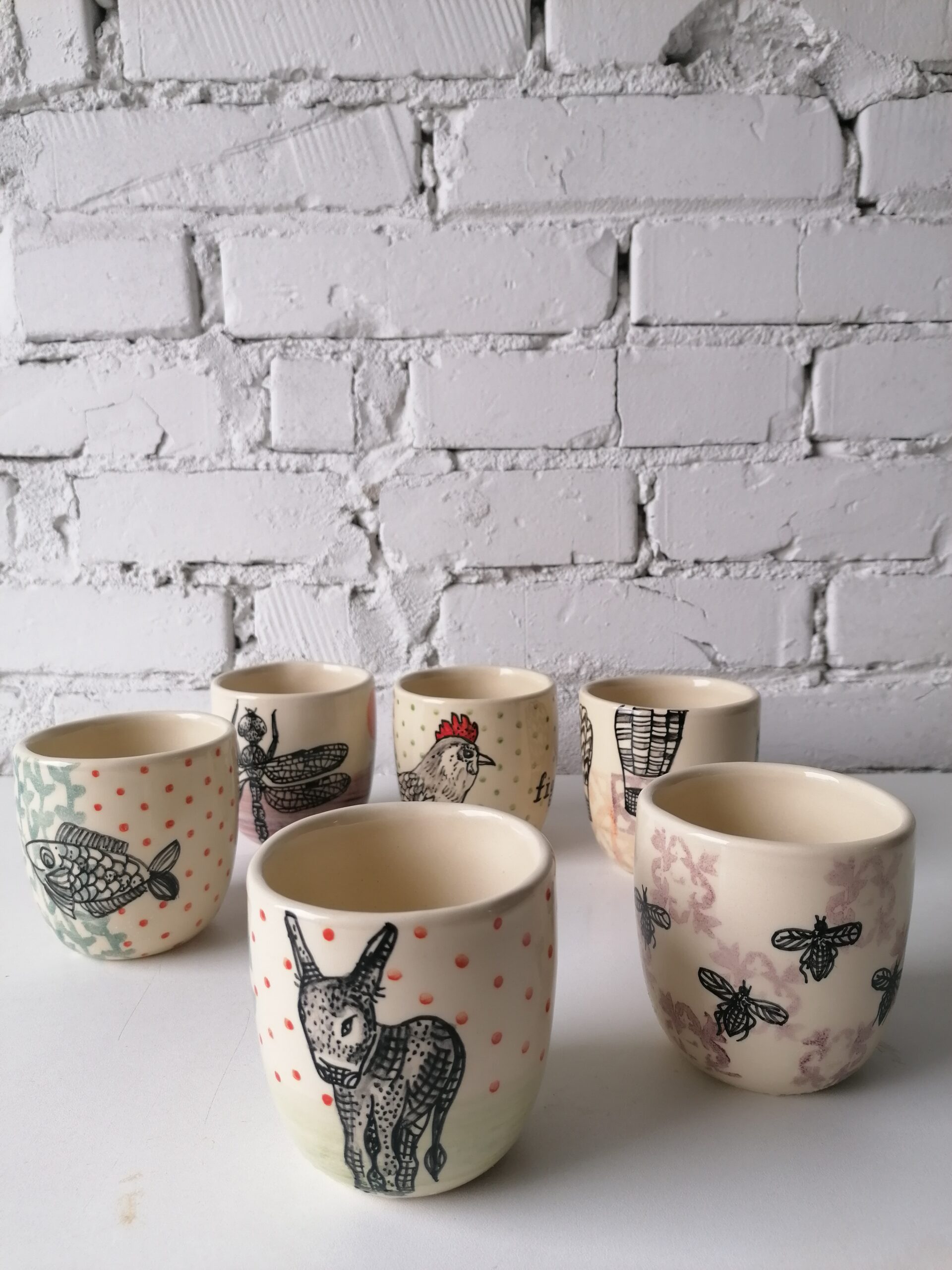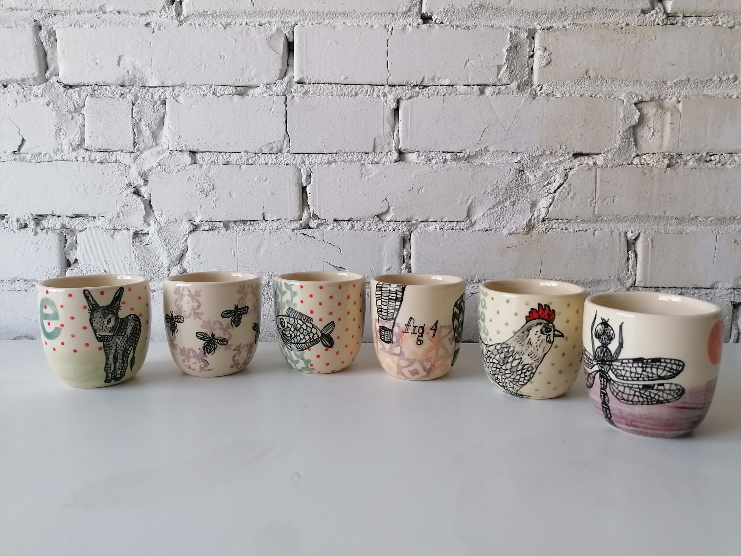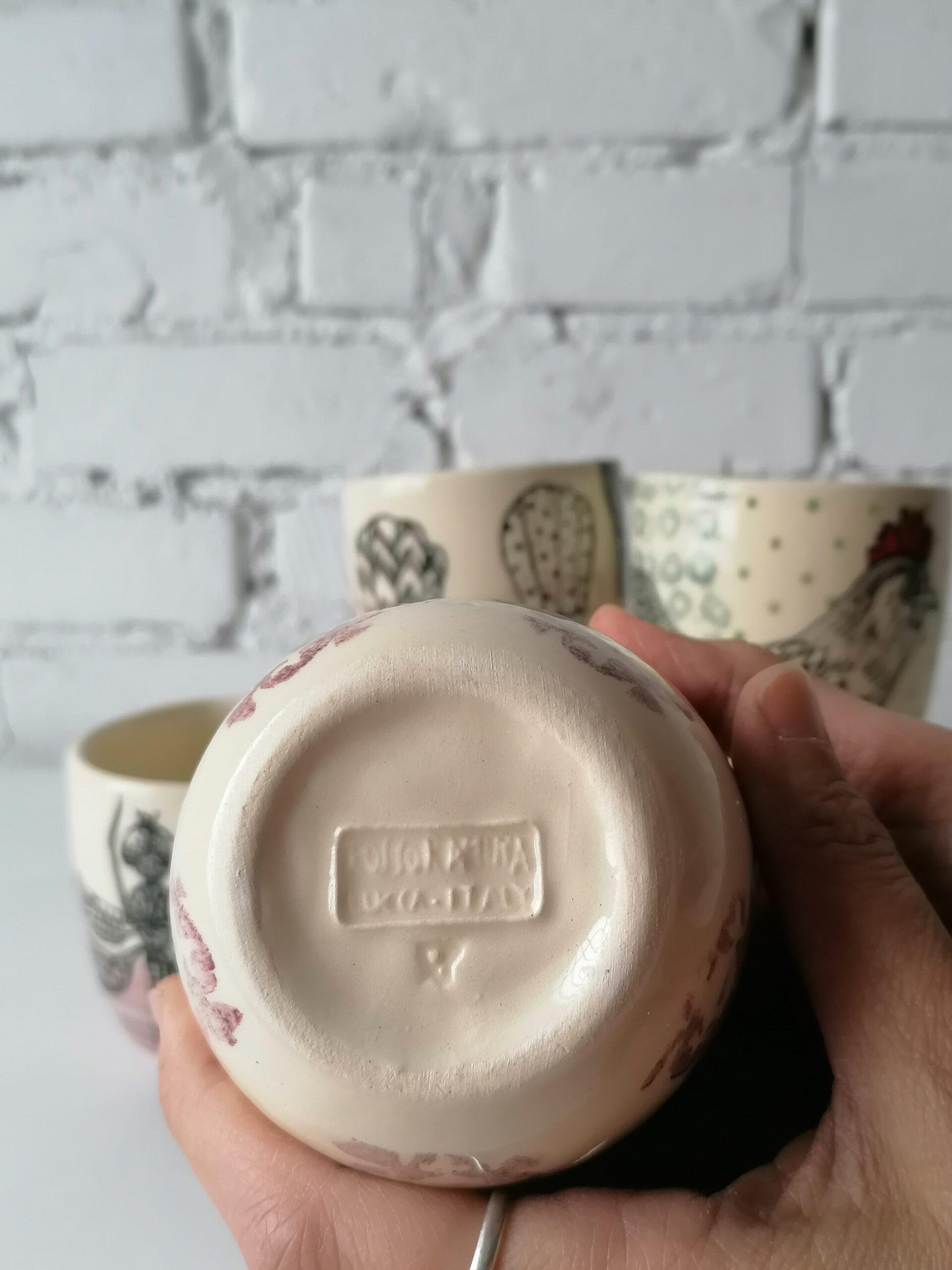 Bicchiere in ceramica realizzata e decorata a mano, in argilla bianca