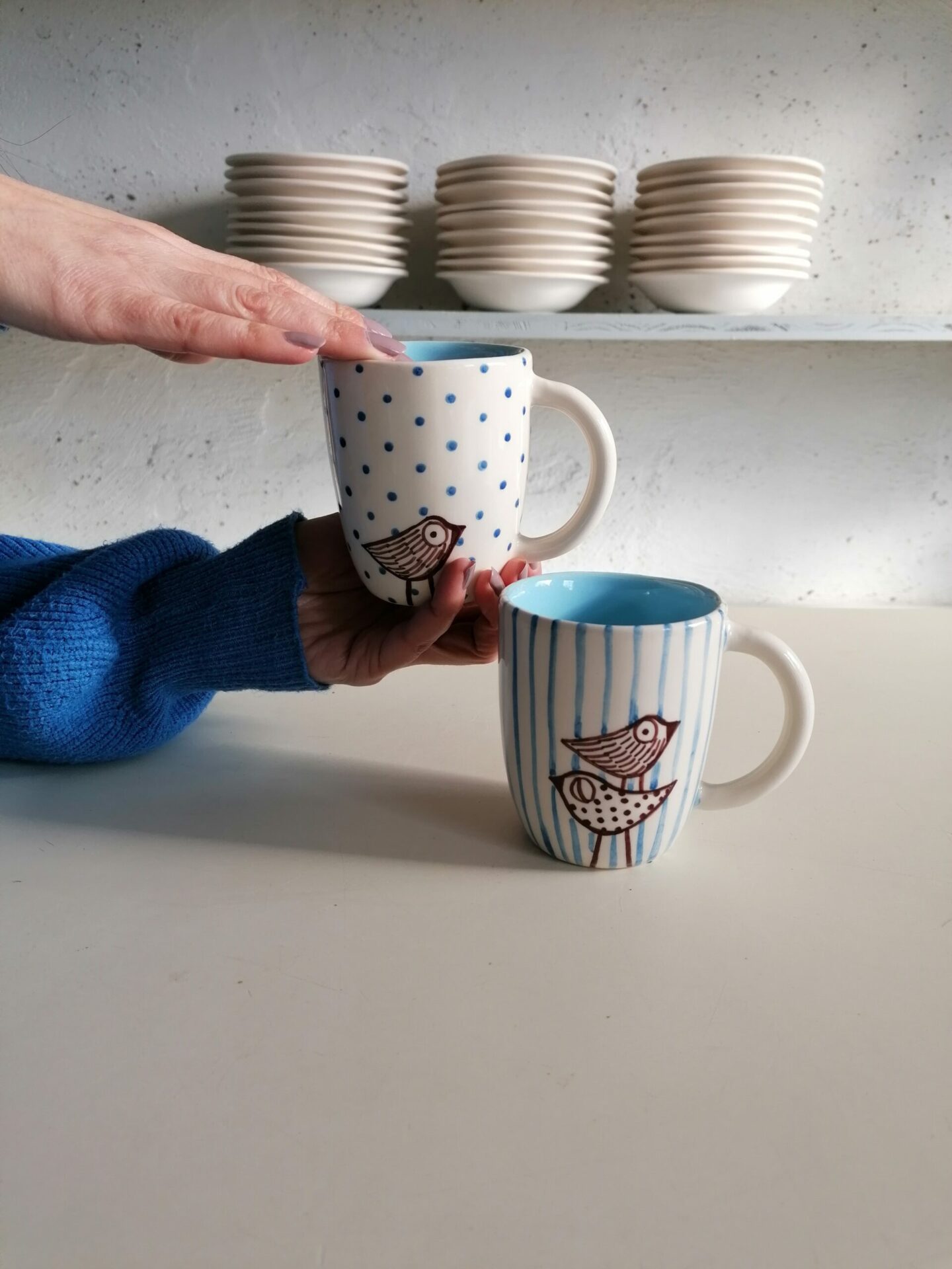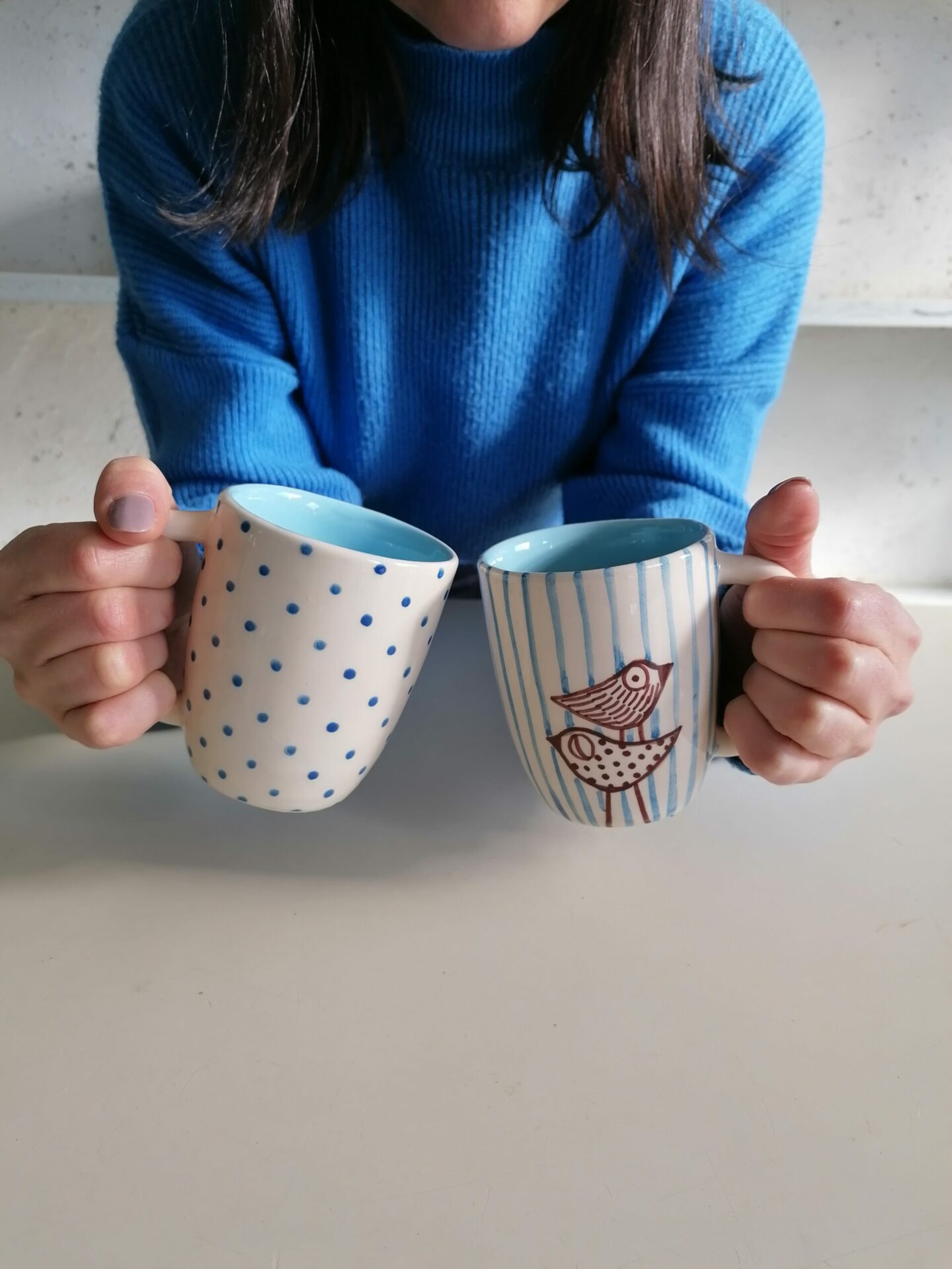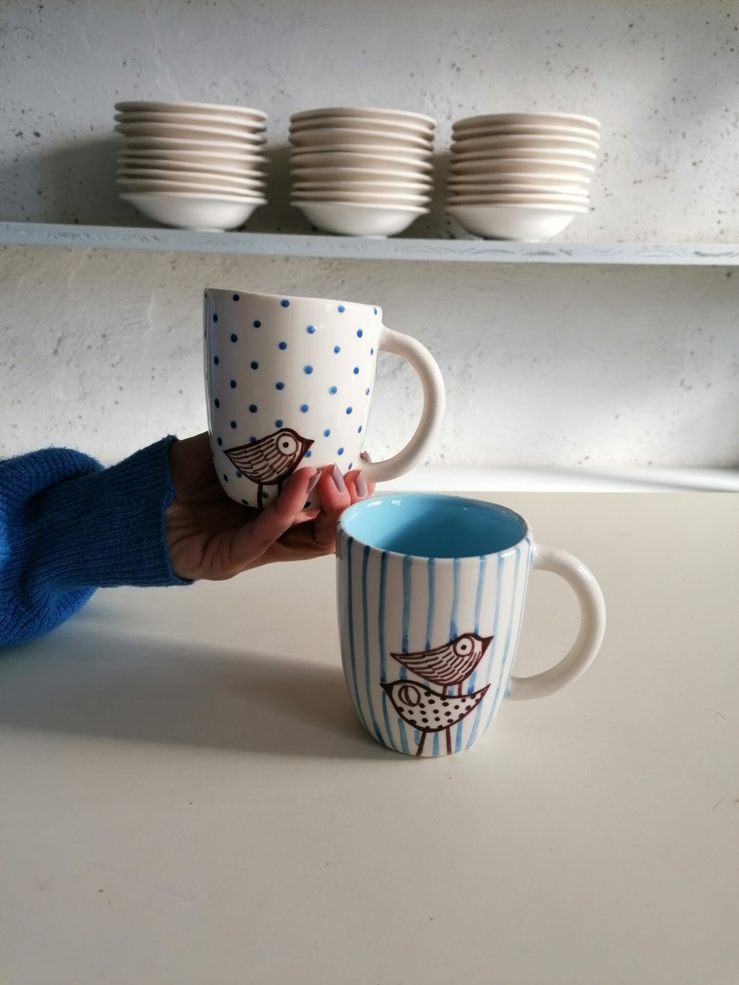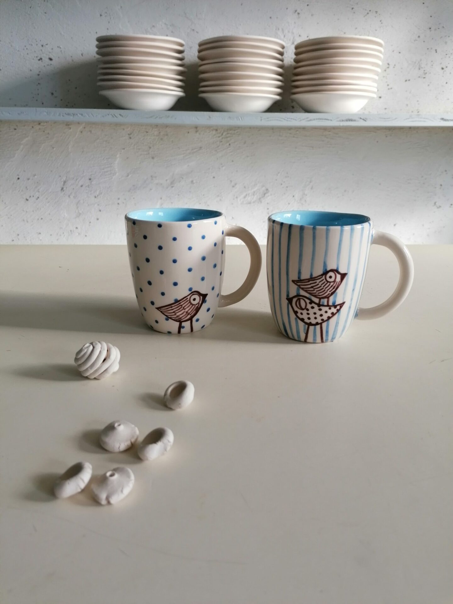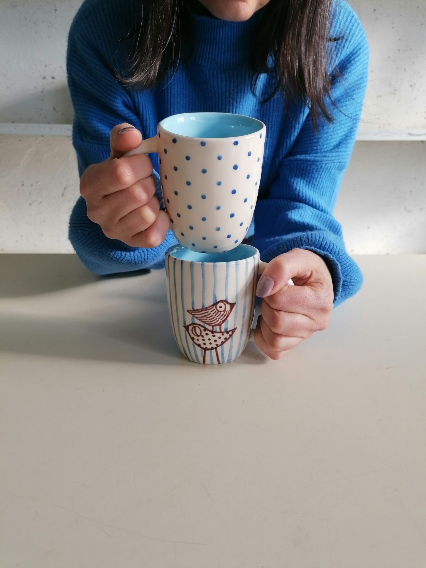 Tazza in ceramica realizzata e decorata a mano, in argilla bianca