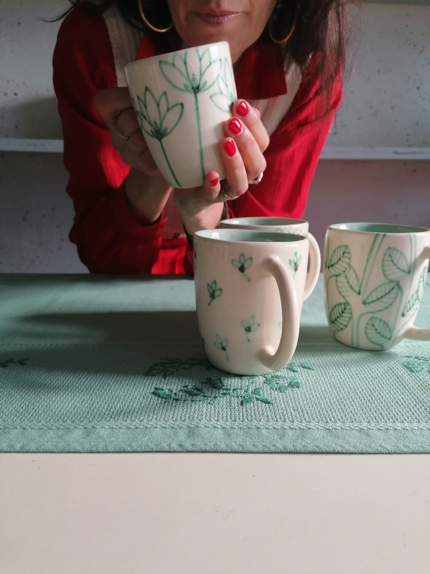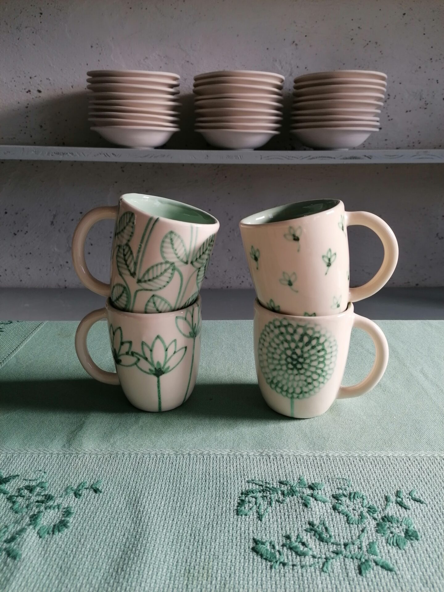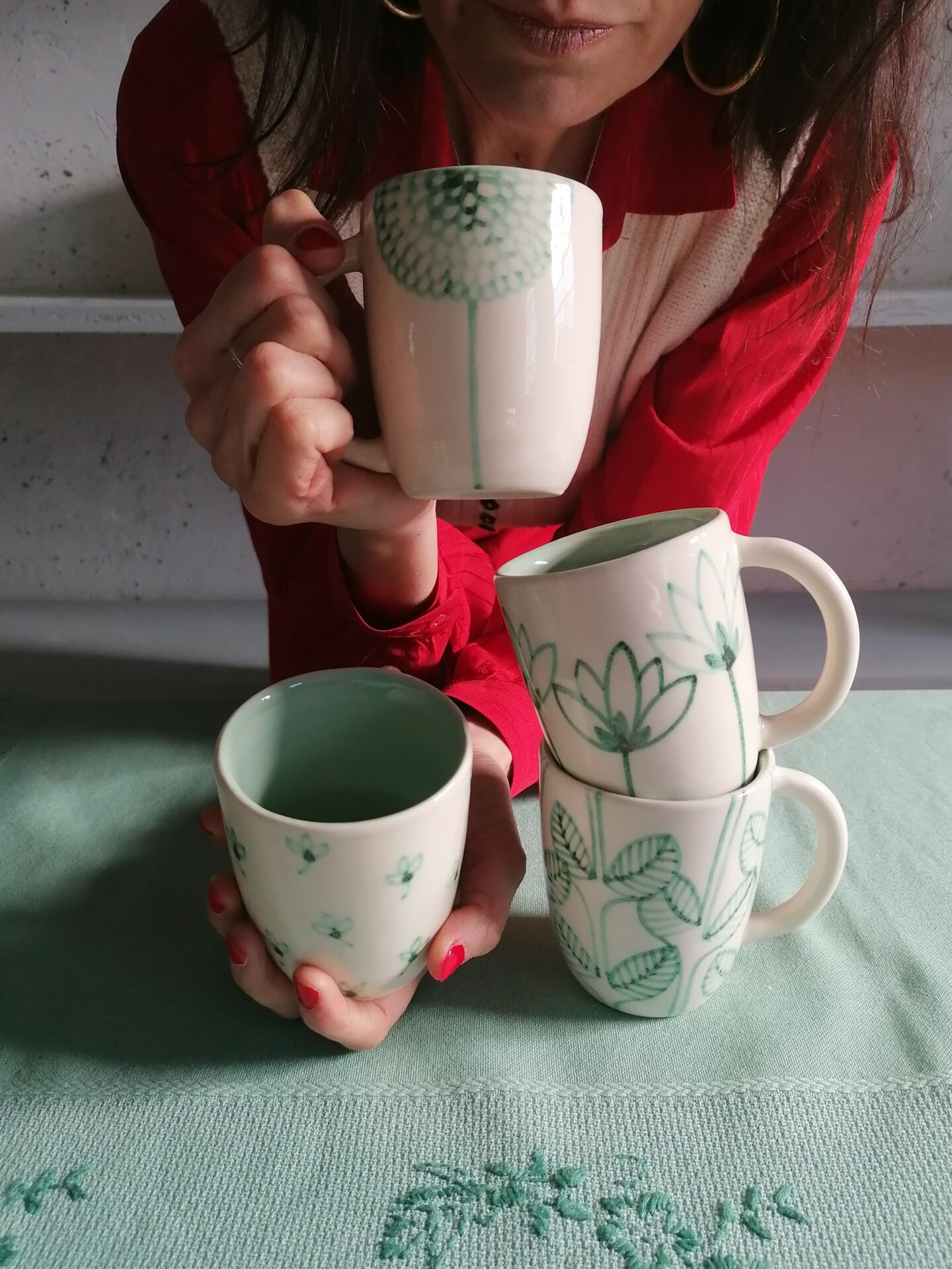 Tazza in ceramica realizzata e decorata a mano, in argilla bianca