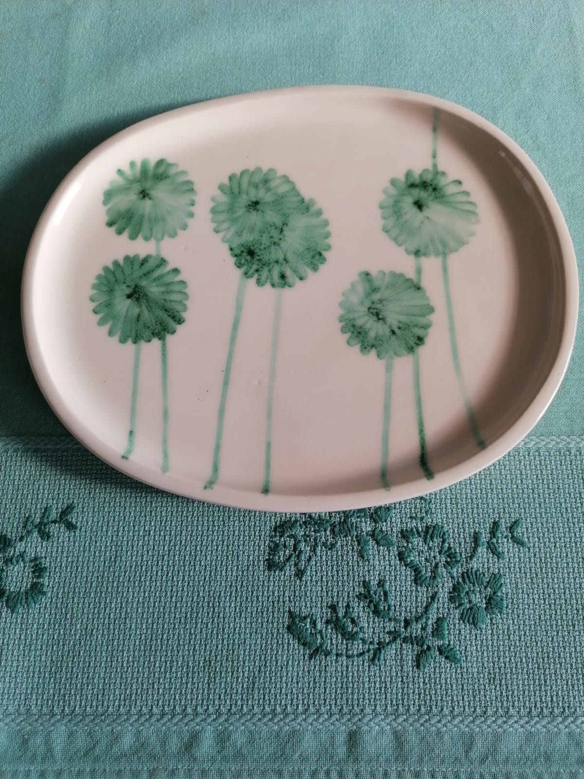 Vassoio in ceramica realizzata e decorata a mano, in argilla bianca