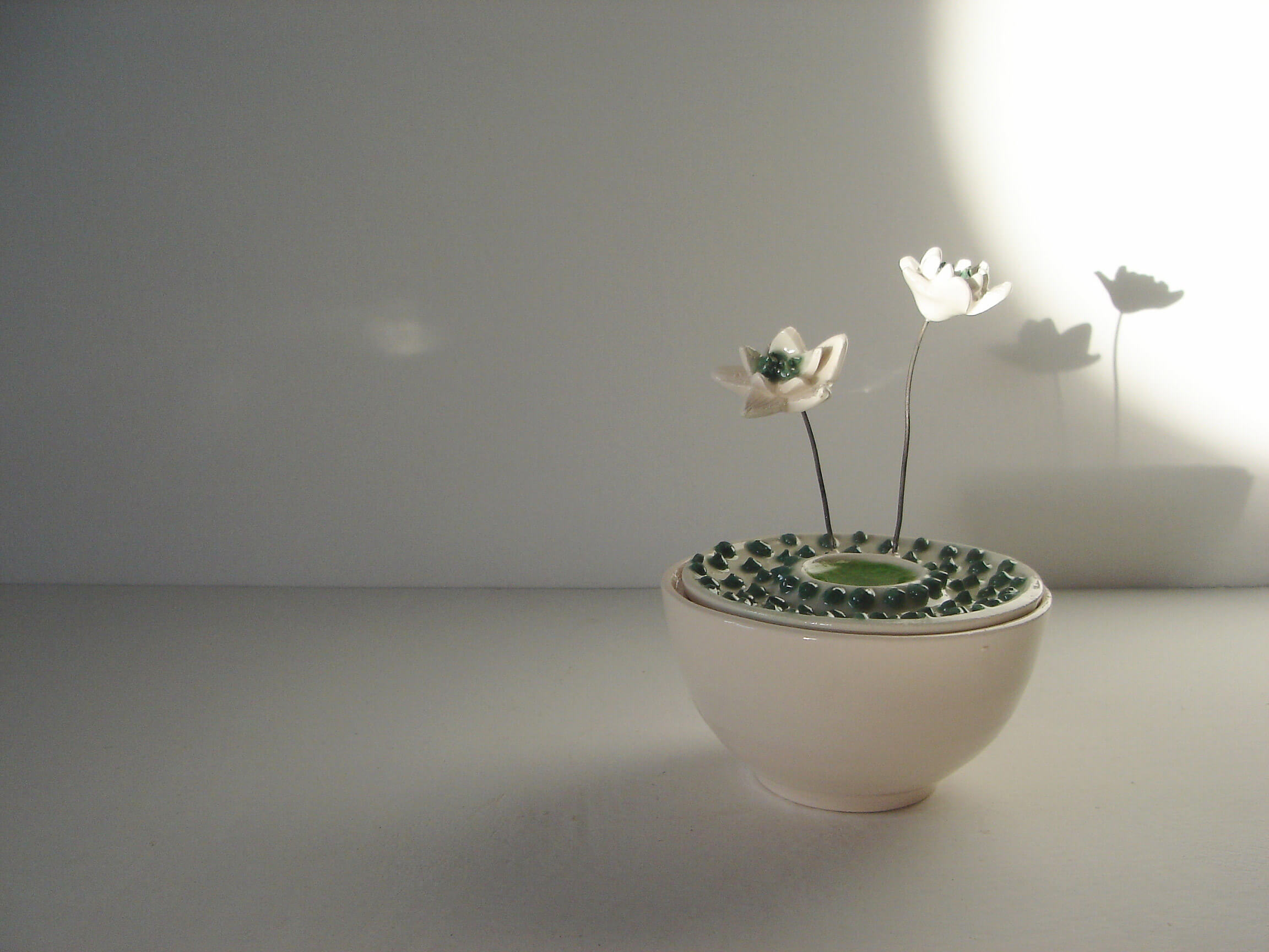 Siamo soliti abbinare i fiori ai momenti più importanti dell’esistenza, dalla nascita alla morte, con la loro fragile natura rappresentano la nostra effimera vita. Io li ho “fermati” su piccole scatoline pensate come contenitori dell’anello importante ma anche in grandi ciotole e in improbabili lampadari.